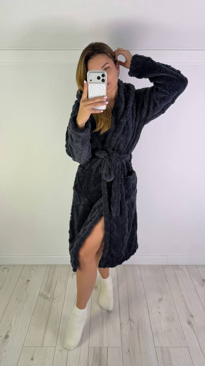 Шукала саме теплий халат на зиму, щоб після душу не мерзнути. Цей варіант — просто знахідка. Тканина щільна, але при цьому легка. Взяла графітовий колір, дуже практичний і стильний. Капюшон глибокий, зручно накидати на мокру голову. Окреме дякую за великі кишені, телефон і всякі дрібниці поміщаються без проблем. Рекомендую!
